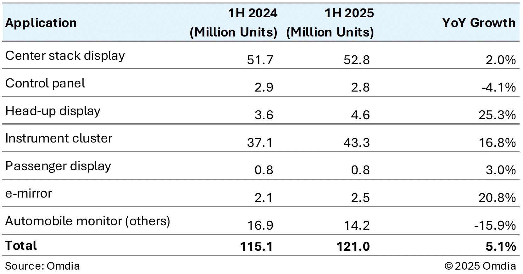 全球各應用汽車顯示器出貨量(2025年上半年與2024年上半年)