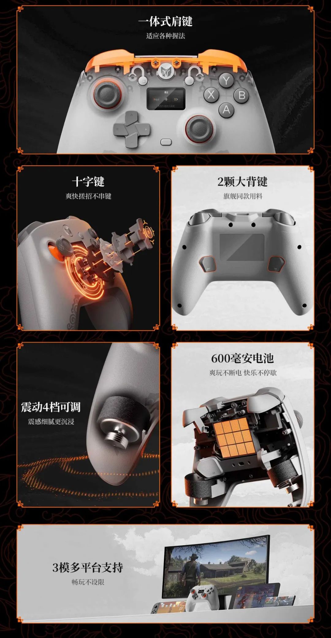 新品手柄支持三模連接,適配 PC、Switch、手機等設備使用。手柄肩鍵采用一體式結構、ABXY 鍵升級靜音按壓(200 萬次使用壽命)、配備彩虹 2 Pro 同款背鍵設計。