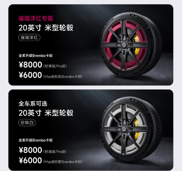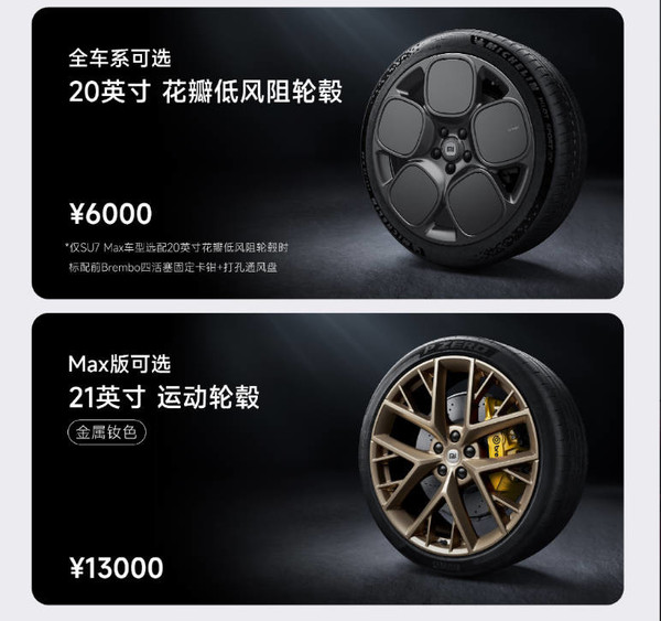 小米SU7 小米15周年限定系列的四款新輪轂為璀璨洋紅20英寸米型輪轂(璀璨洋紅版專屬),升級Brembo卡鉗,標準版/Pro版選裝價格8000元,Max版選裝價格6000元;珍珠白20英寸米型輪轂,標準版/Pro版選裝價格8000元,Max版選裝價格6000元;20英寸花瓣低風阻輪轂,選裝價格6000元;21英寸運動輪轂(Max版可選),選裝價格13000元。