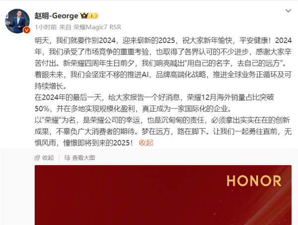 快科技12月31日消息,趙明正成今天,榮耀榮耀CEO趙明在微博上發(fā)布了管理團隊新年致辭。月海