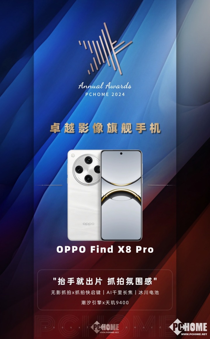 PChome一年一度的榮獲年度卓越產(chǎn)品評選已經(jīng)落下帷幕,2024年度共有數(shù)十款產(chǎn)品中脫穎而出,影像在本次評選活動中,旗艦OPPO Find X8 Pro榮獲PChome 2024卓越影像旗艦手機獎項。手機