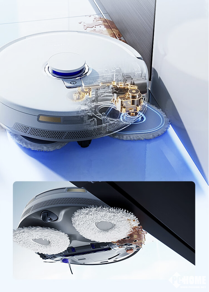 拖地方面,云鯨J5配備了仿生人手擦地系統(tǒng),能夠通過自研的托盤結(jié)構(gòu)對拖布施加恒定8N的下壓力,并且不論是常規(guī)拖地還是拖布外擴時,下壓力都可以做到恒定8N的水準,配合上云鯨獨有的勒洛式三角形拖布,能夠在擦地時不留縫隙。在沿邊清潔時,云鯨J5會通過拖布外擴和扭一扭的操作方式對邊角、死角等區(qū)域進行清潔,保證最大程度覆蓋臟污。